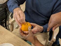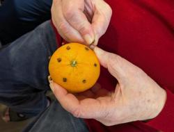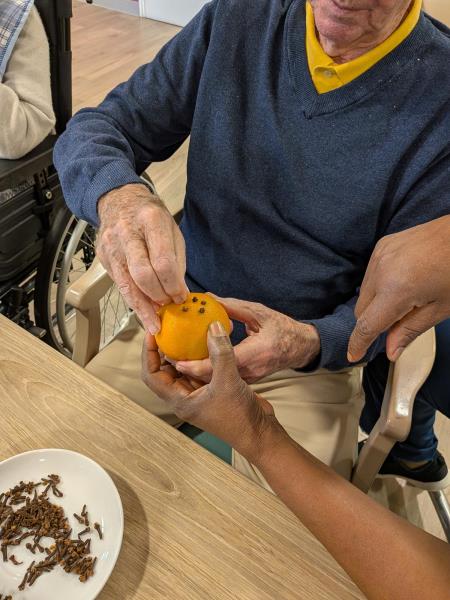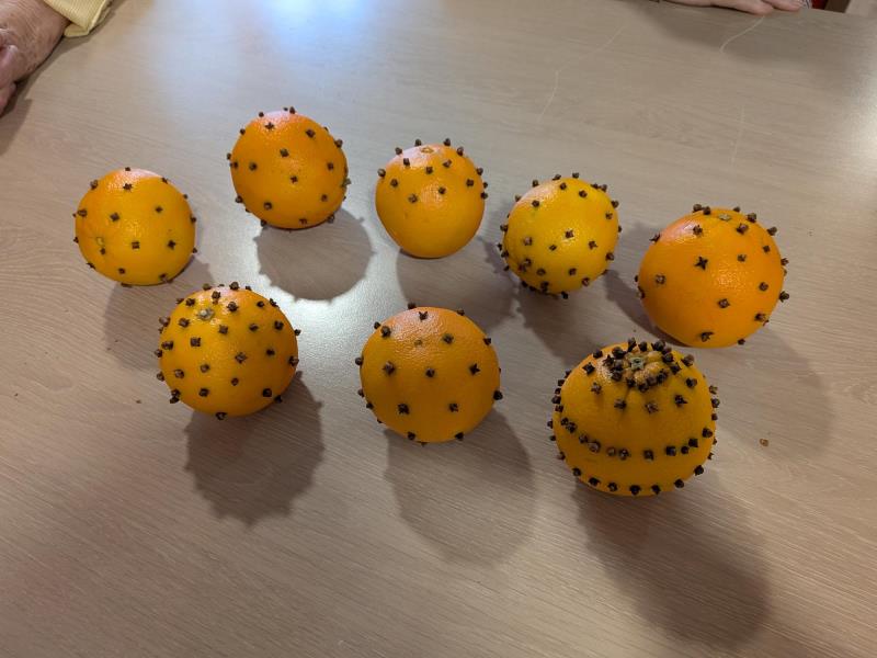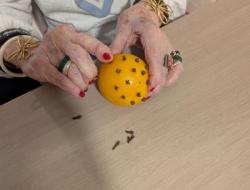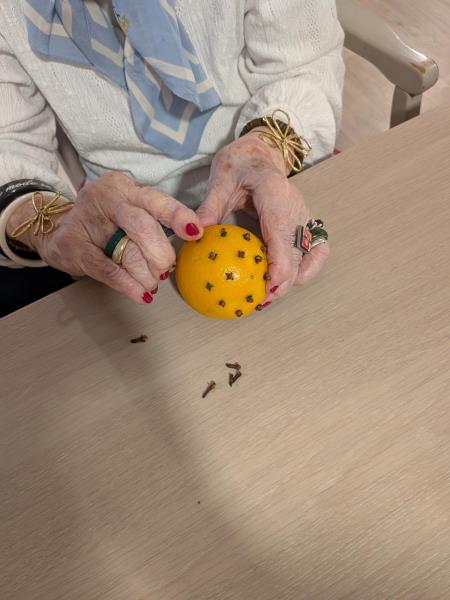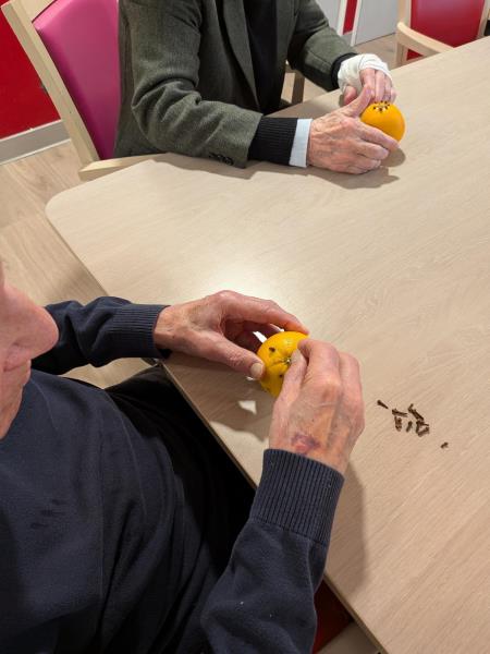 Ce matin, nous avons crée des décorations-senteurs avec les résidents des unités protégées : oranges et clous de girofle.