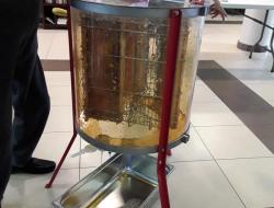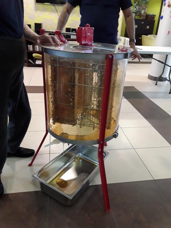 * Dans un second temps les cadres sont placés dans une centrifugeuse, grâce à la vitesse le miel est alors projeté sur les parois. Il coule ensuite dans le récipient placé en dessous de la centrifugeuse