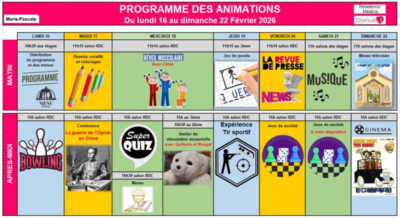 Résidence Médicis > Actualités > Planning des animations du 16 au 22 Février Planning des animations du 16 au 22 Février Publiée le 13/02/2026 Chères familles et proches, Voici le programme des animations de la semaine. Je vous souhaite une belle semaine !