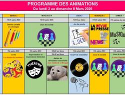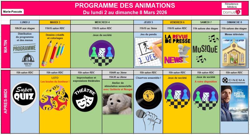 Résidence Médicis > Actualités > Planning des animations du 2 au 8 Mars Planning des animations du 2 au 8 Mars Publiée le 27/02/2026 Chères familles et proches, Voici le programme des animations de la semaine prochaine. Je vous souhaite un très bon week-end !