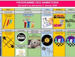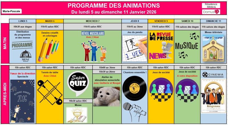 Résidence Médicis > Actualités > Programme des animation du 5 au 11 Janvier Programme des animation du 5 au 11 Janvier Publiée le 05/01/2026 Chères familles et proches, Voici le programme des animations de la semaine. Belle semaine à tous !