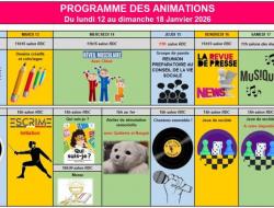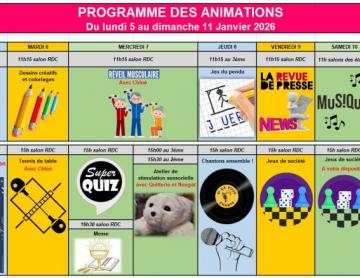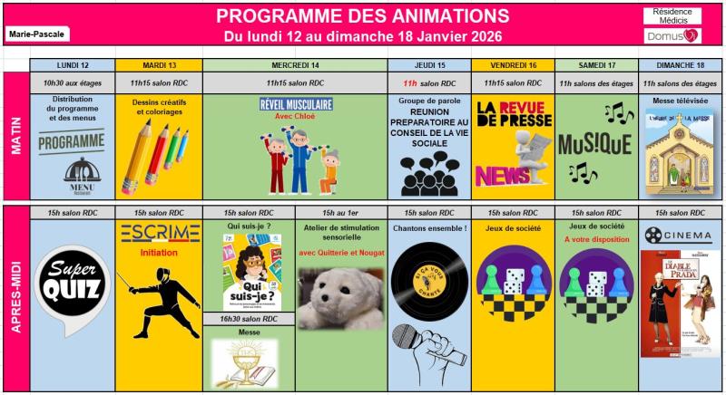 Résidence Médicis > Actualités > Programme des animations du 12 au 18 Janvier Programme des animations du 12 au 18 Janvier Publiée le 09/01/2026 Chères familles et proches, Voici le programme des animations de la semaine. Excellente semaine à tous !