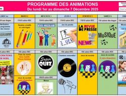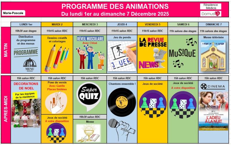 Résidence Médicis > Actualités > Programme des animations du 1er au 7 Décembre Programme des animations du 1er au 7 Décembre Publiée le 01/12/2025 Chères familles et proches, Voici le programme des animations de la semaine. Belle semaine à tous !