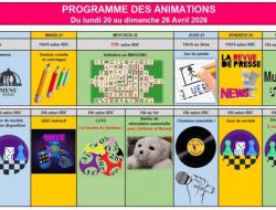 Résidence Médicis > Actualités > Programme des animations du 20 au 26 Avril Programme des animations du 20 au 26 Avril Publiée le 17/04/2026 Chères familles et proches, Voici le programme des animations de la semaine prochaine. Bon week-end à tous.