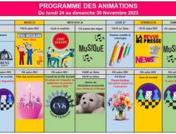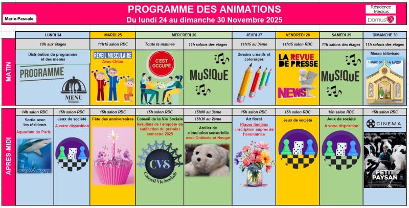 Résidence Médicis > Actualités > Programme des animations du 24 au 30 Novembre Programme des animations du 24 au 30 Novembre Publiée le 21/11/2025 Chères familles et proches, Voici le programme des animations de la semaine prochaine. Je vous souhaite un excellent week-end !