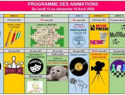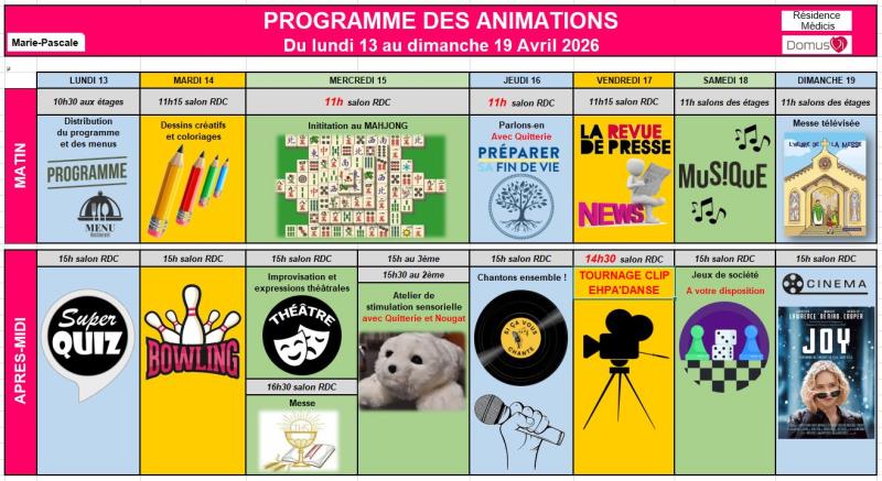 Résidence Médicis > Actualités > Programme des animations du 6 au 12 Avril Programme des animations du 6 au 12 Avril Publiée le 13/04/2026 Chères familles et proches, Voici le programme des animations de la semaine. Belle semaine à tous !