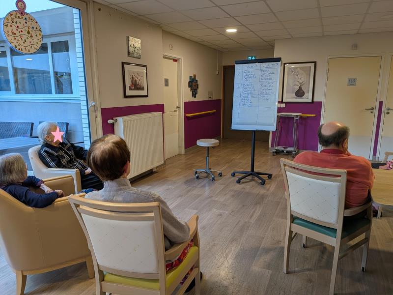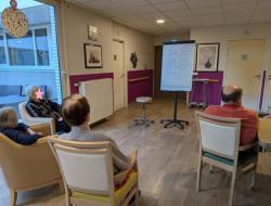 Le mardi matin, les résidents de nos unités de vie protégées Acacia et Camélia profitent d'un temps de stimulation cognitive avec Caroline, psychomotricienne.